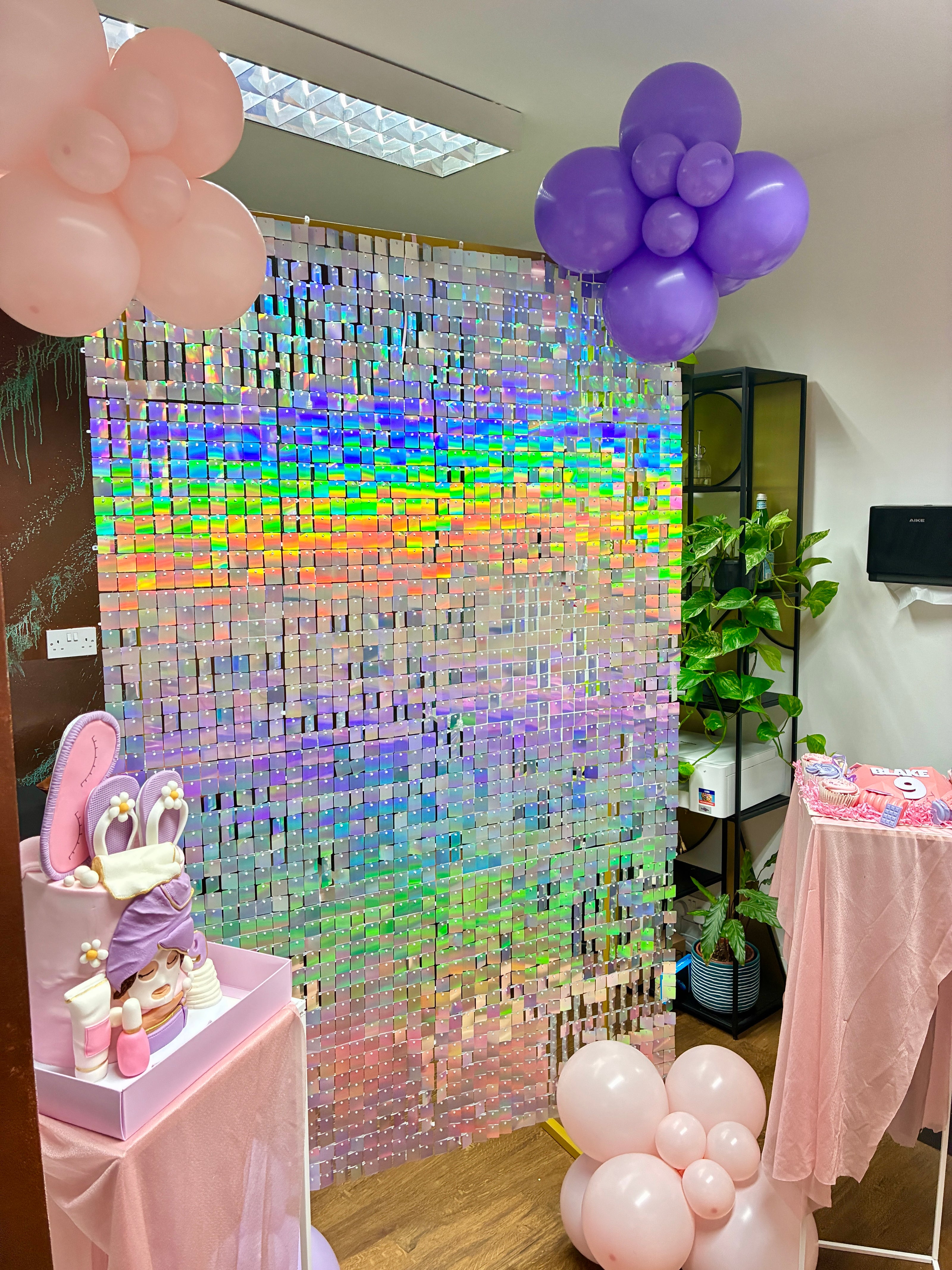 A dazzling photo backdrop in pink, purple, gold, or silver. Perfect for cake-cutting moments! - Sweet Treat Boxes – £6.50 each